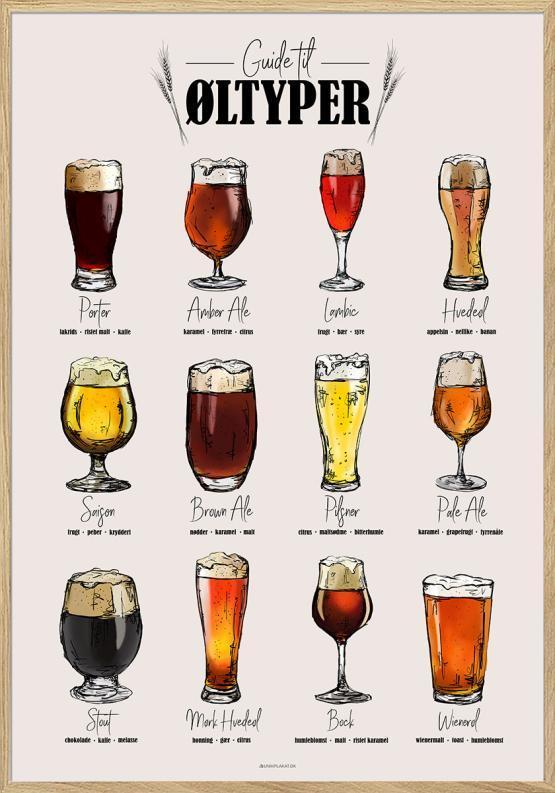 Denne plakat præsenterer en omhyggeligt kurateret samling af 12 forskellige øltyper, som hver især tilbyder sin egen unikke smagsprofil og karakteristika. Uanset om du er en garvet ølentusiast eller blot nysgerrig på at lære mere om de forskellige typer øl, vil denne plakat være din perfekte ledsager. Den fungerer som både et stilfuldt kunstværk og en nyttig reference, der kan inspirere dig til at udforske nye bryggerier og smagsoplevelser.